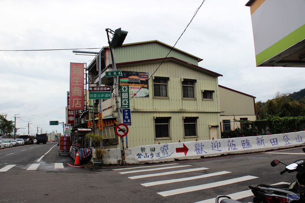 他的在T字路口上,旁邊有一家便利商店,白色矮牆上有印著新田登山步道,看到這個巷子進去就對了